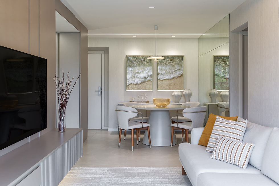 Neste projeto residencial em Itacoatiara, a arquitetura de interiores se revela através da harmonia entre tons neutros, elementos naturais e funcionalidade inteligente. Cada ambiente foi desenhado para oferecer bem-estar, com uma estética leve e acolhedora. A madeira aparece como fio condutor entre os espaços, trazendo calor e identidade, enquanto a iluminação pontual valoriza texturas e cria uma atmosfera de tranquilidade. Cozinha, estar, jantar e varanda se conectam com fluidez, promovendo integração visual e emocional.